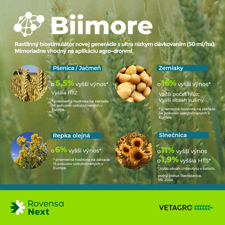 Biimore ukazuje, že v modernej rastlinnej výrobe už nemusí platiť jednoduchá rovnica „vyššia dávka = vyšší efekt“. Pri správnom termíne a kvalitnej aplikácii môže aj ultra-nízka dávka zohrávať zmysluplnú úlohu v období, keď sa rozhoduje o tvorbe úrody, kvalite produkcie a celkovej kondícii porastu. Práve v tom spočíva jeho zaujímavosť: nie je postavený na objeme, ale na fyziologickej logike účinku, kontrolovanej výrobe a presnosti zásahu. V kombinácii s modernými spôsobmi aplikácie, vrátane dronov, preto Biimore zapadá do smeru, ktorým sa rastlinná výroba prirodzene posúva k vyššej efektivite, lepšiemu načasovaniu a presnejšiemu využitiu každého vstupu.